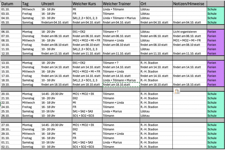 In der unten aufgeführten Excel-Tabelle findet ihr eine genaue Auflistung welcher Kurs wann und wo stattfindet.
